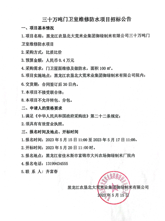 黑龍江農(nóng)墾北大荒米業(yè)集團(tuán)御綠制米有限公司三十萬(wàn)噸門衛(wèi)室維修防水項(xiàng)目招標(biāo)公告