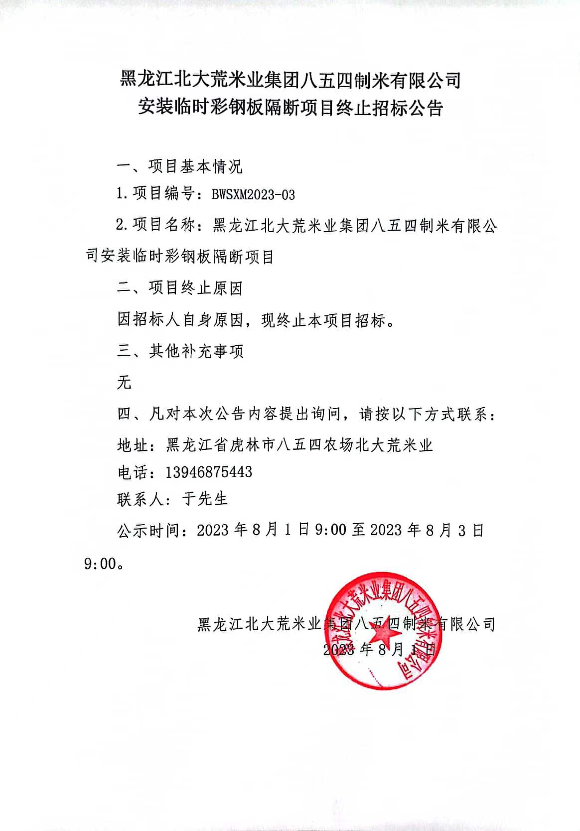 黑龍江北大荒米業(yè)集團八五四制米有限公司安裝臨時彩鋼板隔斷項目終止招標公告