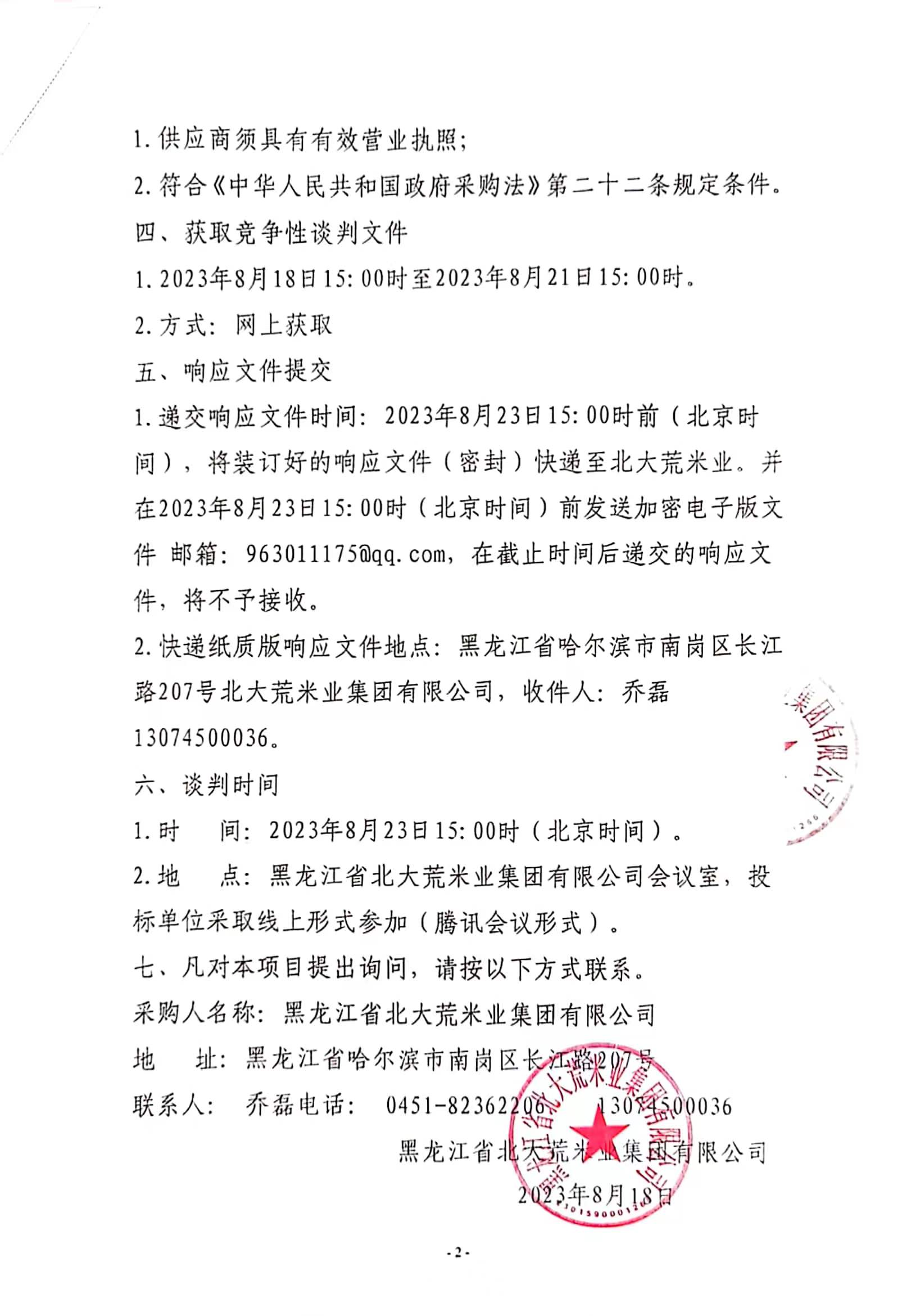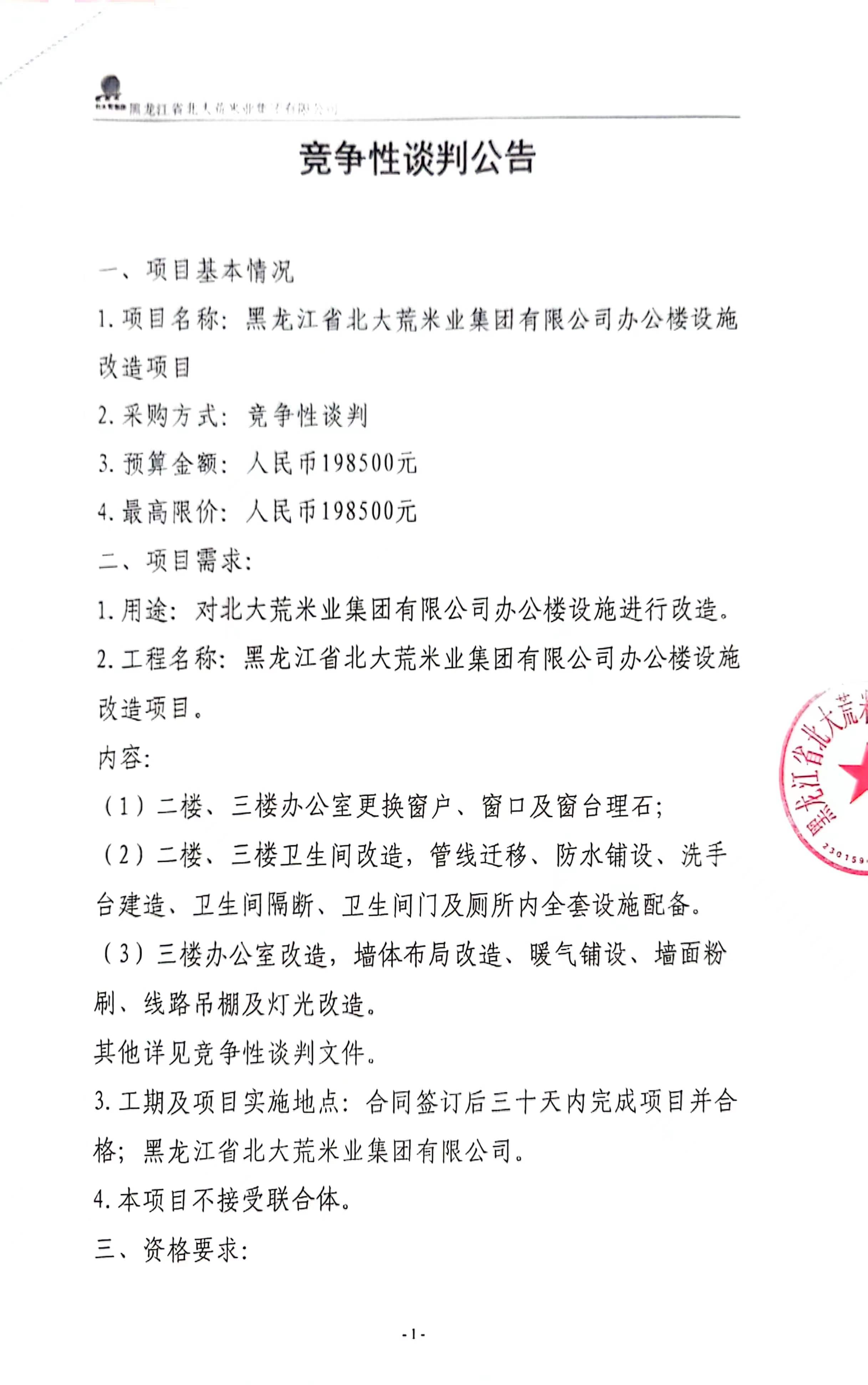 黑龍江省北大荒米業(yè)集團(tuán)有限公司辦公樓設(shè)施改造項(xiàng)目競爭性談判公告