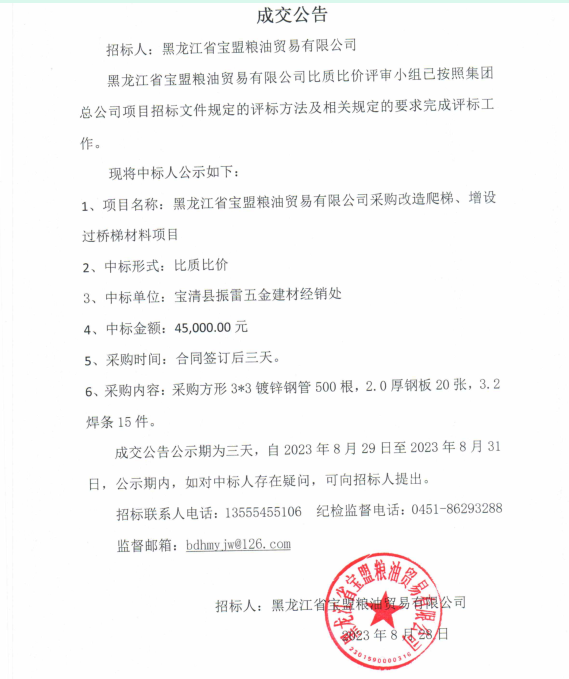 黑龍江省寶盟糧油貿(mào)易有限公司采購改造爬梯、增設(shè)過橋梯材料項(xiàng)目中標(biāo)公告