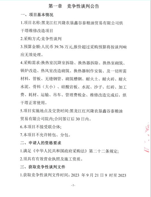 黑龍江紅興隆農(nóng)墾鑫谷泰糧油貿(mào)易有限公司烘干塔維修改造項目競爭性談判公告