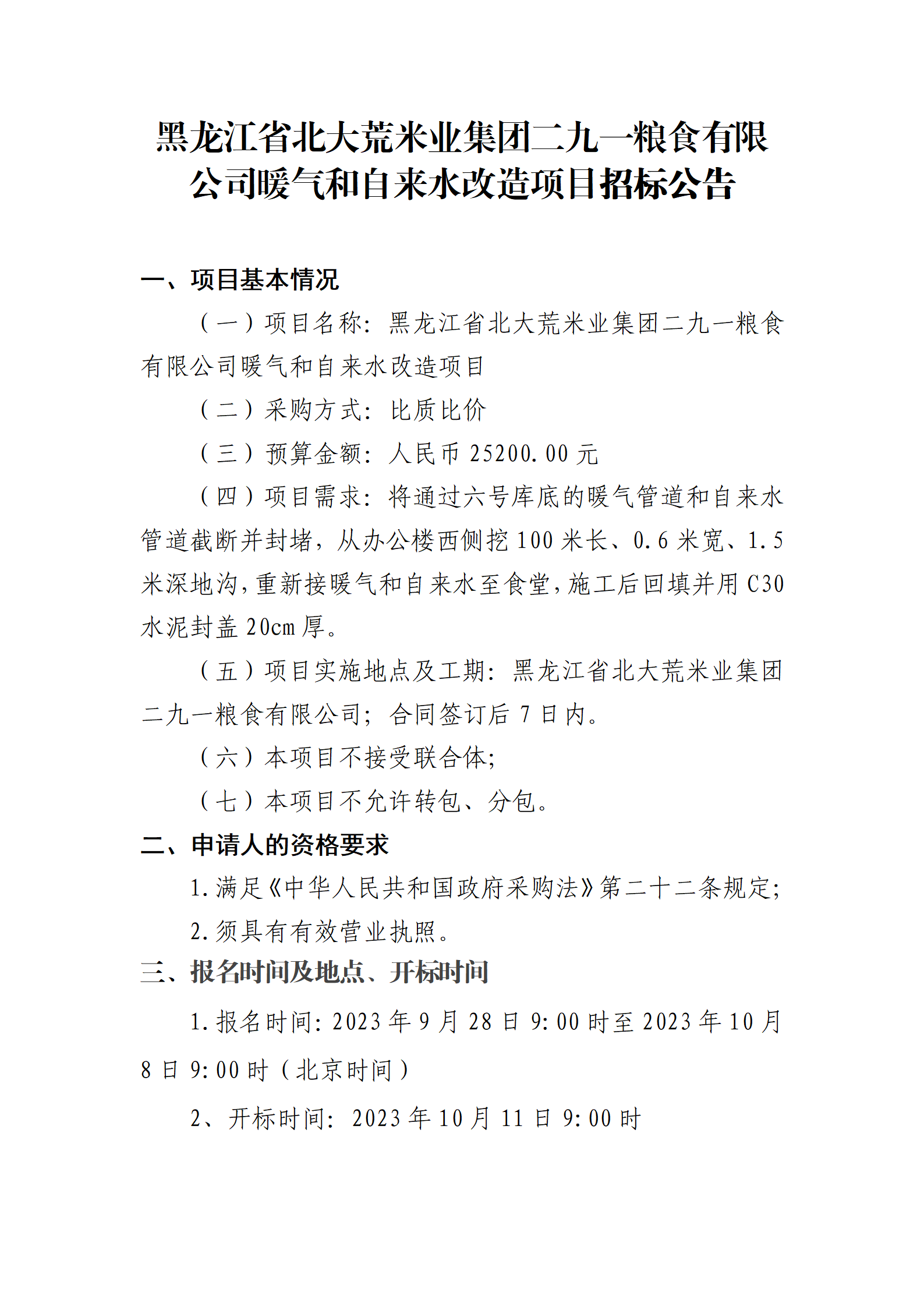 黑龍江省北大荒米業(yè)集團二九一糧食有限公司暖氣和自來水改造項目招標(biāo)公告