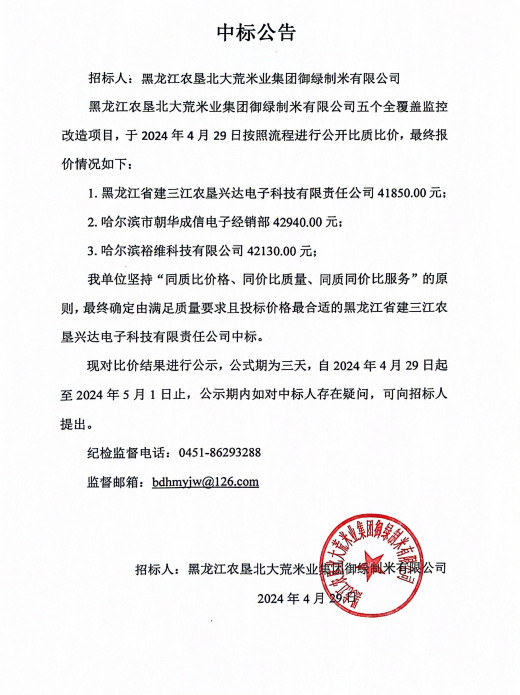 北大荒米業(yè)御綠公司五個(gè)全覆蓋監(jiān)控改造項(xiàng)目中標(biāo)公告