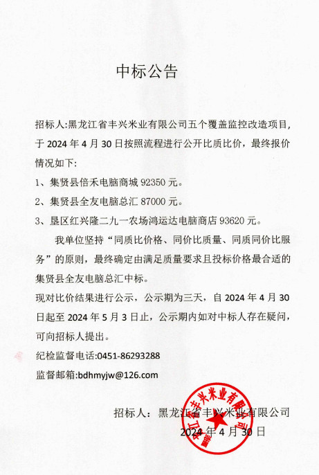 黑龍江省豐興公司五個(gè)全覆蓋監(jiān)控改造項(xiàng)目中標(biāo)公告