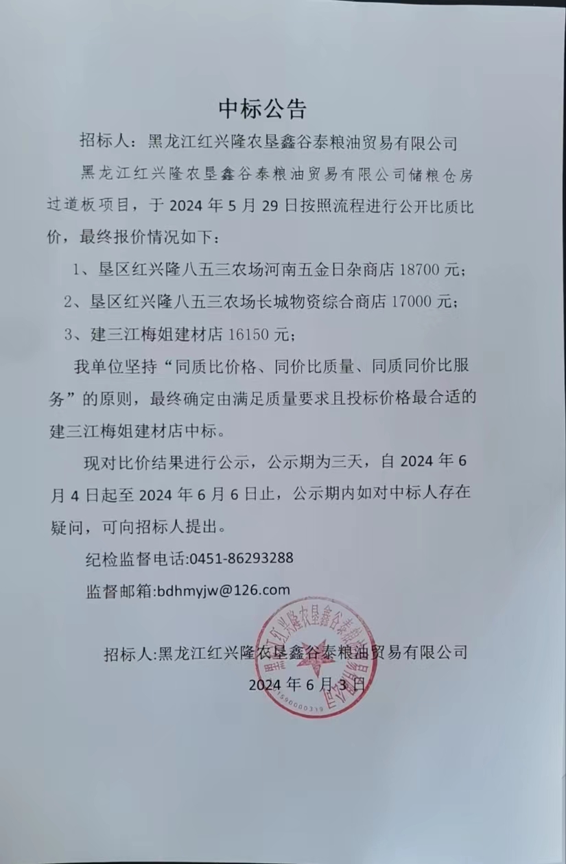 黑龍江紅興隆農(nóng)墾鑫谷泰糧油貿(mào)易有限公司糧儲倉房過道板項目中標公告