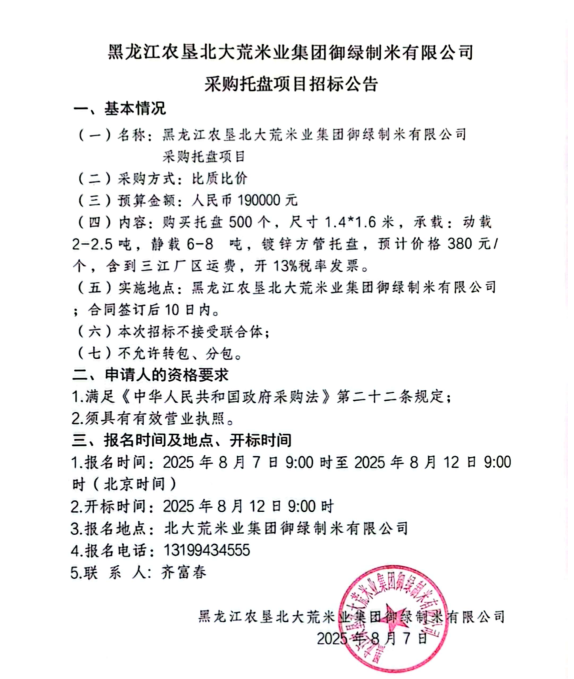 黑龍江省北大荒米業(yè)集團御綠制米有限公司采購托盤項目招標公告