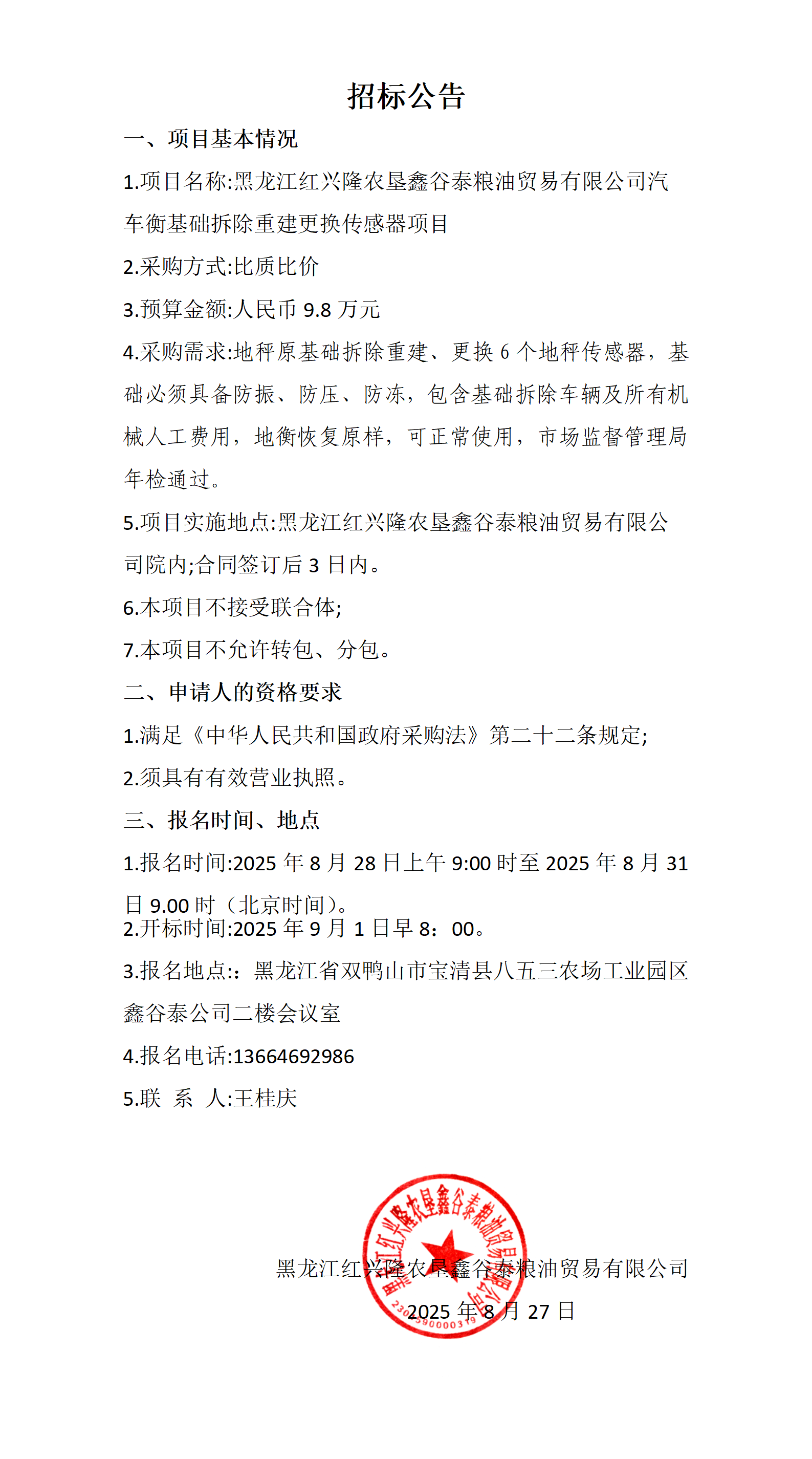 黑龍江紅興隆農(nóng)墾鑫谷泰糧油貿(mào)易有限公司汽車衡基礎(chǔ)拆除重建更換傳感器項目招標公告