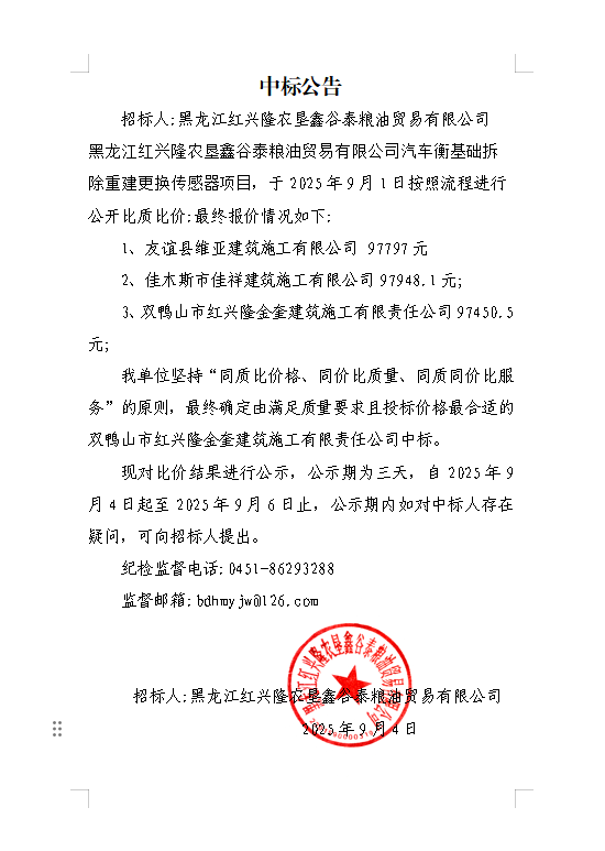 鑫谷泰汽車衡基礎(chǔ)拆除重建更換傳感器項(xiàng)目中標(biāo)公告