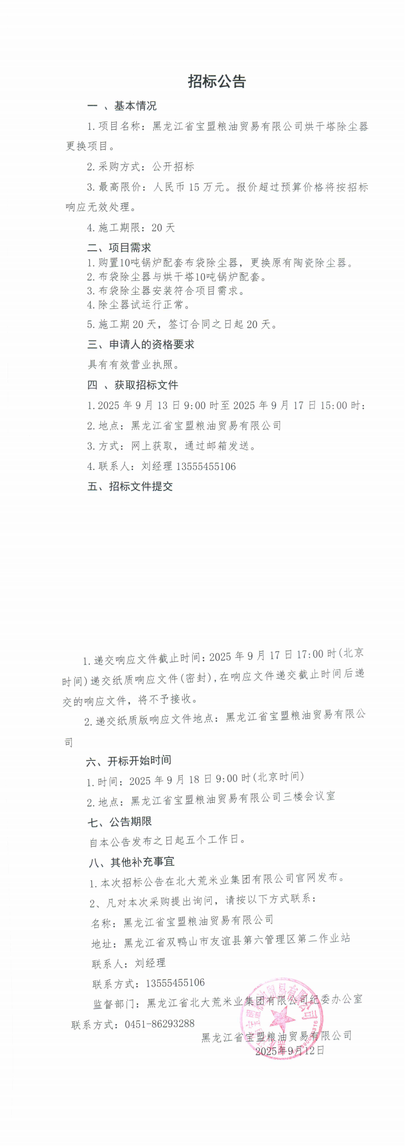 寶盟糧油貿(mào)易有限公司烘干塔除塵器更換項(xiàng)目招標(biāo)公告
