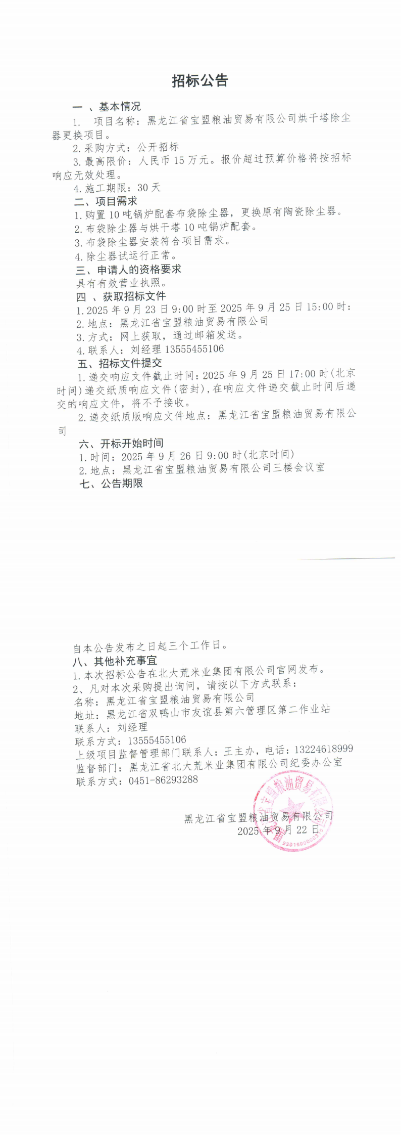 黑龍江省寶盟糧油貿(mào)易有限公司烘干塔除塵器更換項(xiàng)目招標(biāo)公告