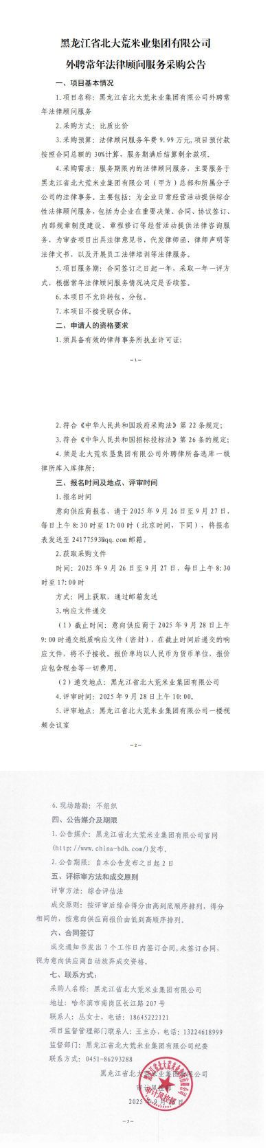 黑龍江省北大荒米業(yè)集團(tuán)有限公司外聘常年法律顧問服務(wù)采購(gòu)公告